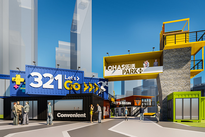 Cafe Infinity學生中心,交叉的彩色集裝箱