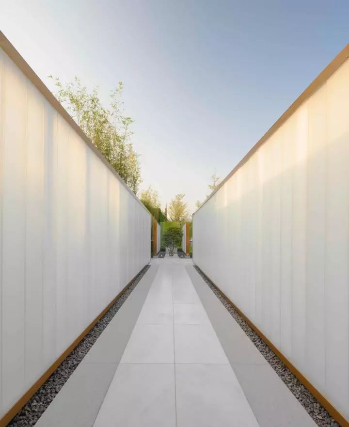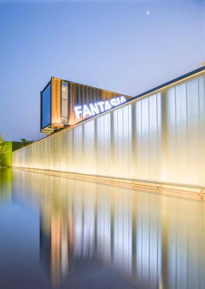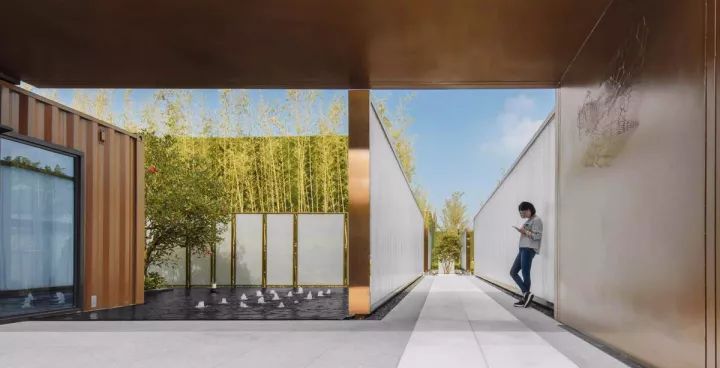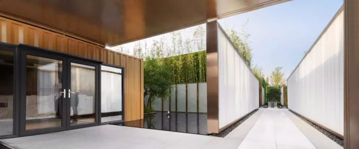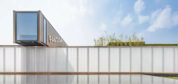先看外部:項(xiàng)目外圍的兩道U型玻璃景墻,把集裝箱建筑圍合在內(nèi)部,無法一眼看到真容。