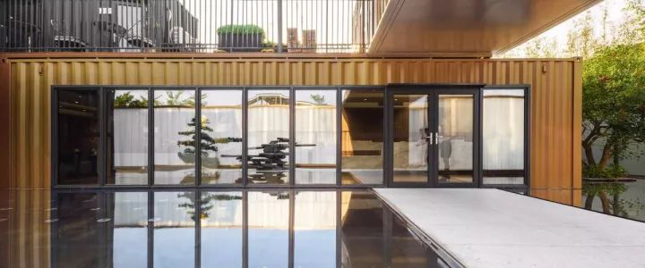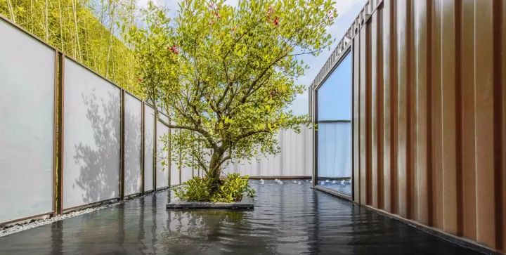 集裝箱的側(cè)墻,被完全改為落地玻璃取景框,水中的這棵樹,猶抱琵琶地成為了接待區(qū)的對景。