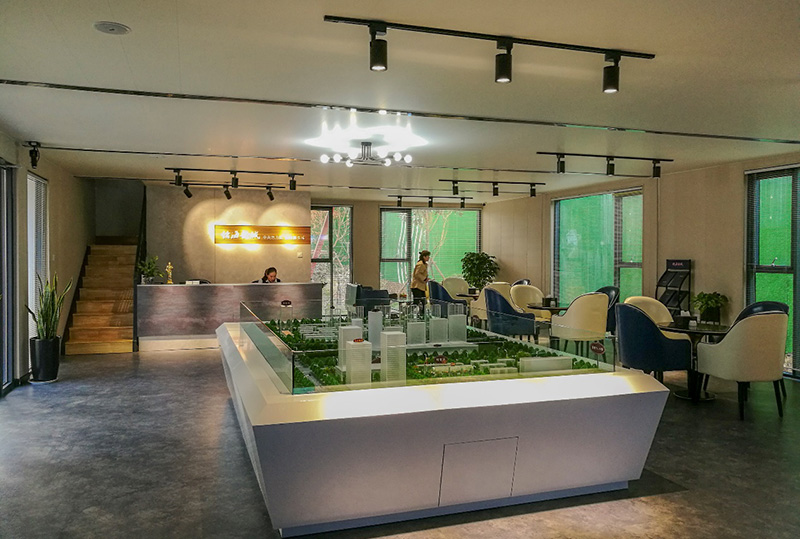 一層接待大廳設(shè)有前臺、沙盤區(qū)、接待區(qū)、衛(wèi)生間和VIP室