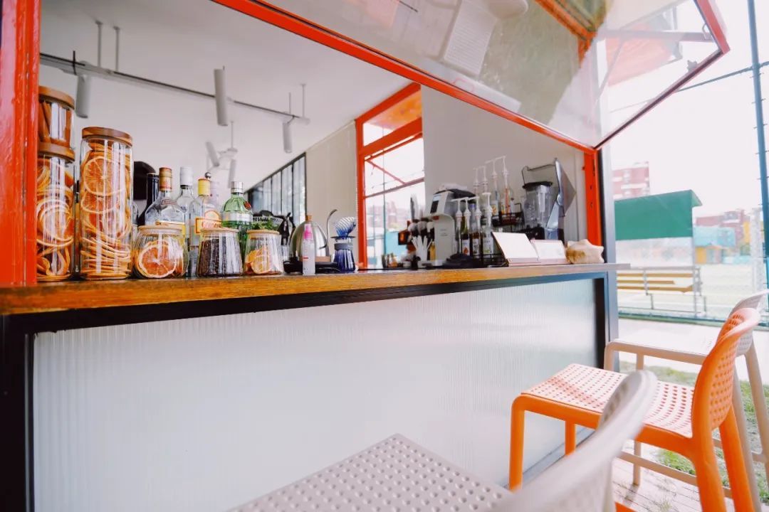集裝箱咖啡館以橙色主基調(diào),每一面都開有落地窗或玻璃門,不僅將咖啡館融于糧倉這一景點中,成為景色的一部分,也方便顧客從任一方位都可自由進入內(nèi)部。