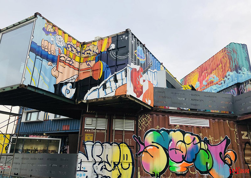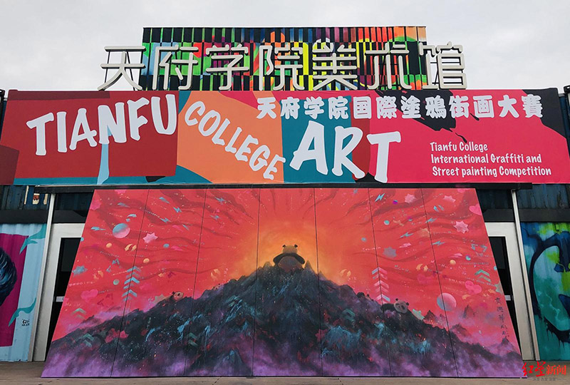 本次大賽的作品展示現(xiàn)場,是全國首座由78個集裝箱組成的西財天府學(xué)院美術(shù)館。其獨立而另類的建筑構(gòu)成和別具一格的外形,與基因中自帶奔放氣質(zhì)的涂鴉和街畫藝術(shù)相得益彰。大賽中入圍“上墻創(chuàng)作名單”的作品,就涂繪在這些集裝箱空間的外部。