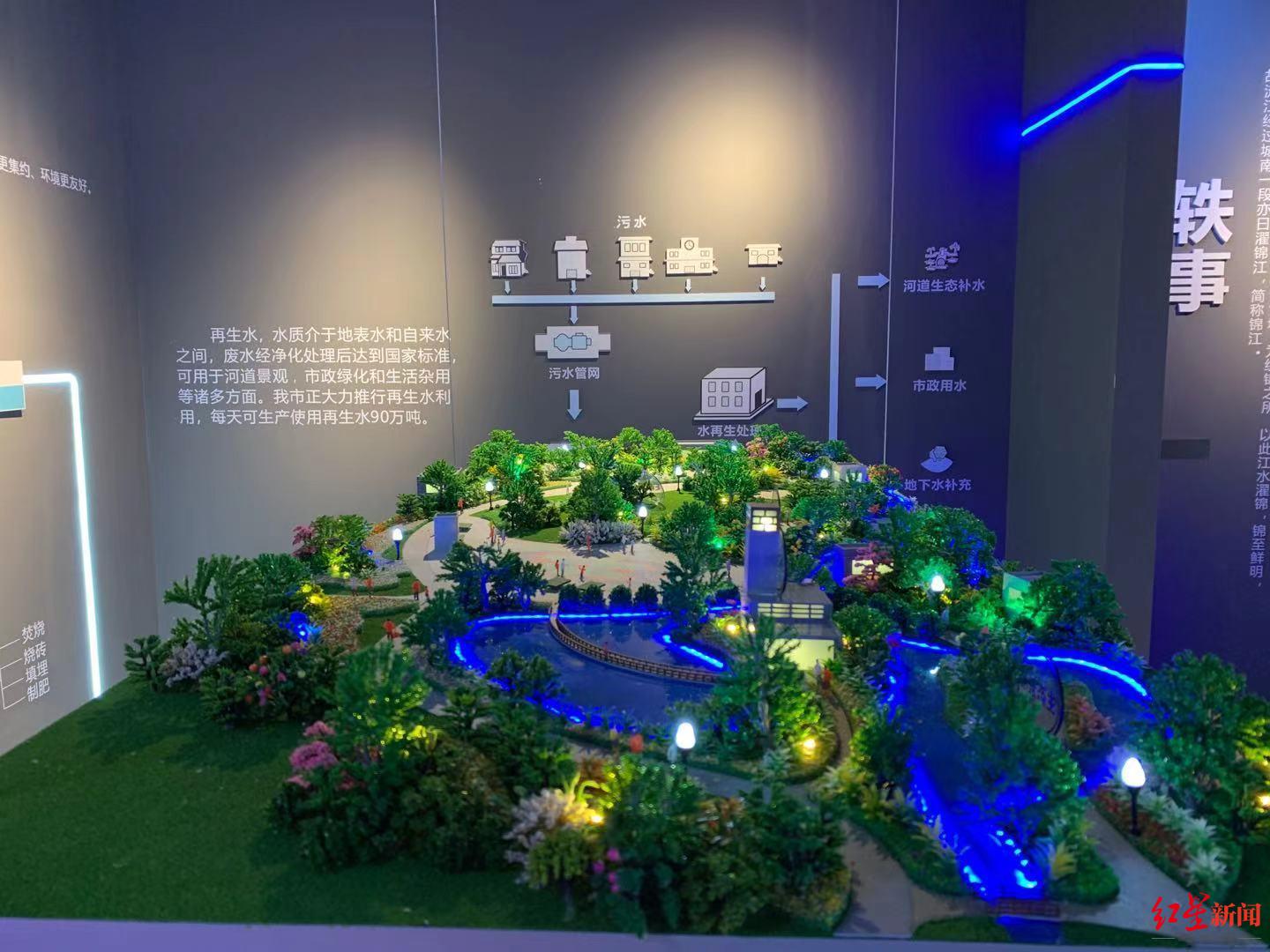 從外表看上,坐落在錦城湖上的快閃博物館顯得有點平平無奇,但走進一看,里面卻是“別有洞天”。在現場,由四個集裝箱改造而成的博物館內,劃分成“供”“排”“凈”“治”四個微型展廳,內部由燈帶串起,通過模型、投影、3D打印等技術,展示水在途經都江堰、自來水廠、千家萬戶,再進行污水處理等環節,重現了水的一生。
