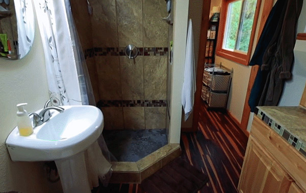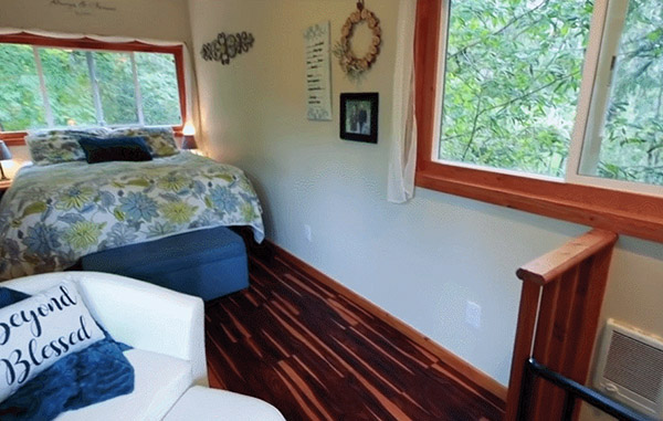 如果說一樓還只是功能齊全的小戶型之光,二樓根本就是風(fēng)光無限的人間伊甸園。順著螺旋扶梯往上走,就來到了屋子的二層,也就是摞在上面的另一個(gè)稍小一些的集裝箱。一上來,特地裁出來的超大窗戶里露出的美麗的森林風(fēng)景,就令人忍不住wow出聲,這不是我做夢都想住的那種房間嗎?!又大又舒服的雙人床,特地選用了和窗外風(fēng)景呼應(yīng)的森系風(fēng)。躺在這里的雙人大床上,不僅可以望見滿眼蒼翠,還能聽見林間的葉聲、溪間的水聲。每天,Dave還會(huì)在臥室的窗戶邊放好喂鳥器,等著和早上飛來的小鳥互道早安。