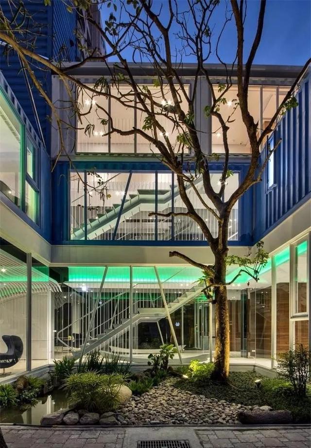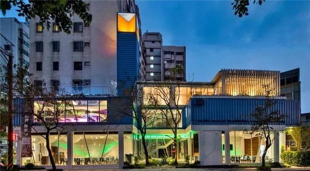 看到如此熟悉的紋路,就應該知道這又是一家集裝箱改造而成的三層建筑了。然而事實是建筑的外表僅以集裝箱鐵皮作為裝飾,實則為鋼骨結構。外觀以藍白為主,形似一艘大船停泊在黎明路上。